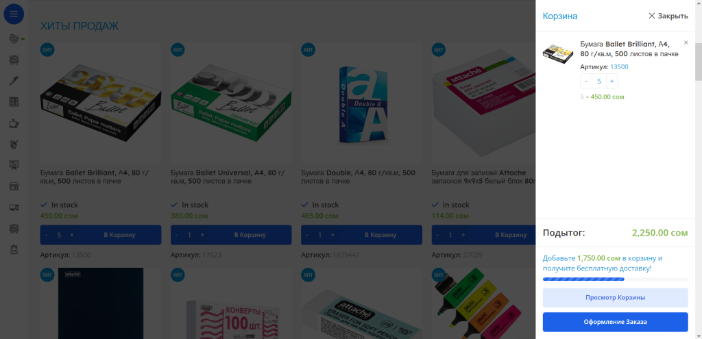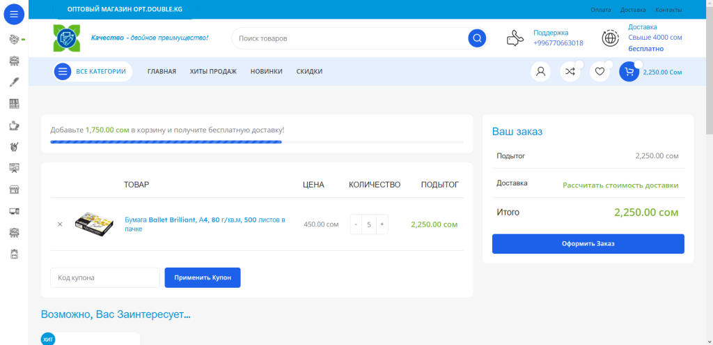 Для отправки заказа необходимо предварительно пройти авторизацию/регистрацию. Затем выбрать товар в каталоге и добавить его в корзину. Когда вы выберите один или более товаров, в правом углу страницы появиться всплывающее окно со списком выбранных товаров, которые вы желаете приобрести через корзину: