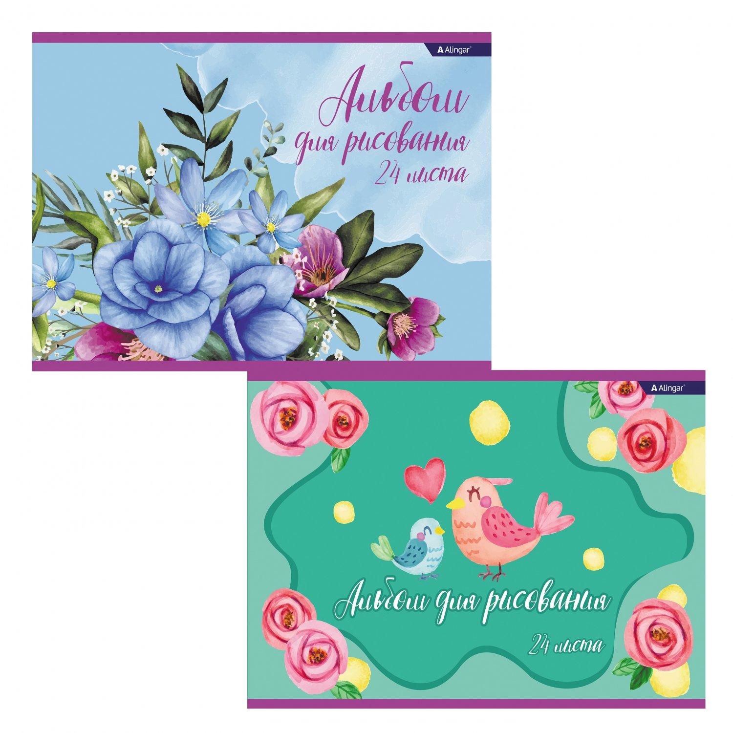 Альбом для рисования А4 24л., Alingar, на скрепке, мелованный картон (стандарт), 100 г/м2, “Нежные цветы”
