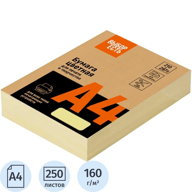 Цветная бумага Выбор есть пастельного жёлтого цвета предназначена для печати на всех видах оргтехники и ризографах. Точно передаёт все оттенки, чёткость изображения, мгновенно впитывает чернила и обеспечивает высокое разрешение. Идеально подходит для документов, презентаций, рекламных материалов, открыток.