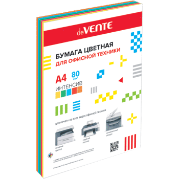 Бумага цветная для офисной техники “deVENTE” A4 100 л, 80 г/м², интенсивные цвета, ассорти (5 цветов) картонная подложка, в термоусадочной