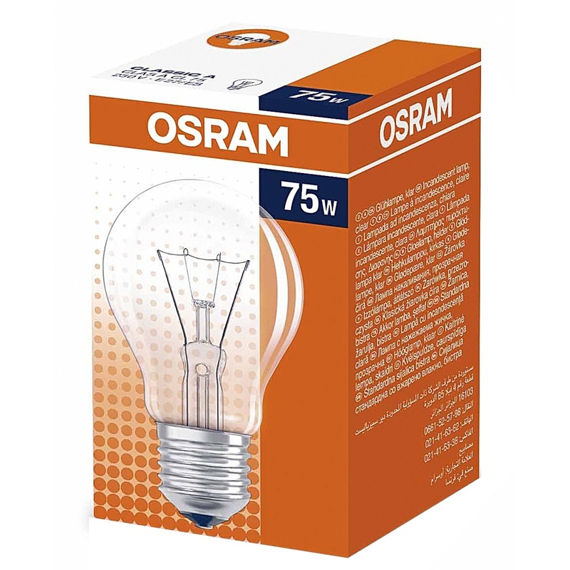 Лампа накаливания классической формы груши Osram (прозрачная), излучает теплый белый свет, с цоколем E27, мощность 75 Вт. Неокисляющийся алюминиевый цоколь. Не содержит свинец и опасные для человека вещества. Код модели CLAS A CL 75W 2.