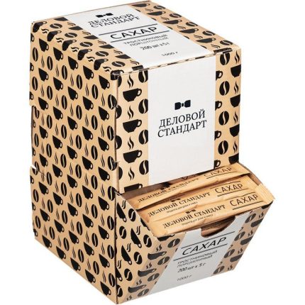 Сахар-рафинад «Деловой Стандарт» спрессован небольшими кусочками. Расфасован по 1 кг в картонные коробки. Вес одного кубика — 5,5 г. На каждую коробку нанесена перфорация для легкого вскрытия. Сахар кусковой быстро растворяется в воде любой температуры.