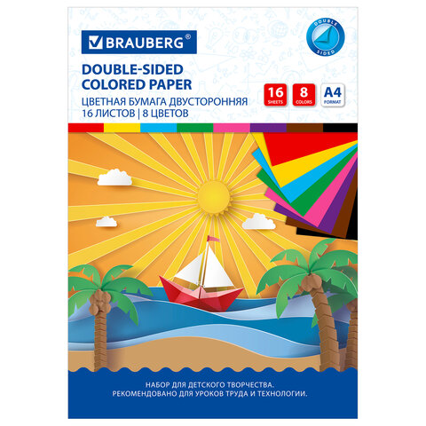 Набор офсетной двусторонней цветной бумаги плотностью 65 г/м2 включает 16 листов формата А4 (200х275 мм) в 8-ми разнообразных и насыщенных однородных цветах. Листы скреплены скобами, легко режутся и сгибаются.